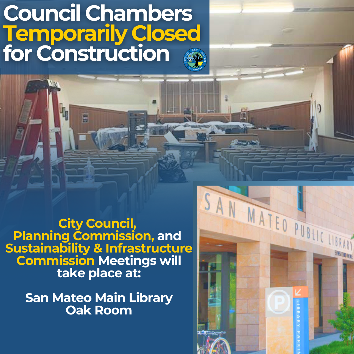 The San Mateo City Council Chambers room is temporarily closed for construction and AV system improvements. Upcoming City Council, Planning Commission, and Sustainability & Infrastructure Commission meetings will take place at the San Mateo Main Library (55 W 3rd Ave.) in the Oak Room.
